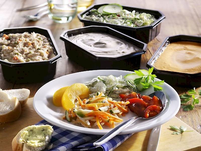 Huzarensalade, vers fruit, rauwkost salade, salade van het huis, waldorfsalade, cocktailsaus, smokey barbecue saus en kruidencrème.