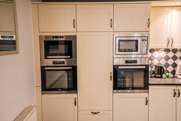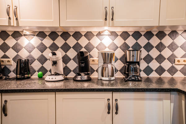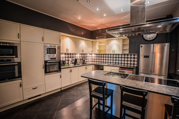 De luxe keuken is ingericht met alle denkbare apparatuur zoals een dubbele kookplaat, 2 vaatwassers, 2 magnetronovens en een koelkast.