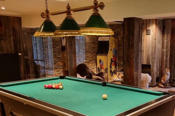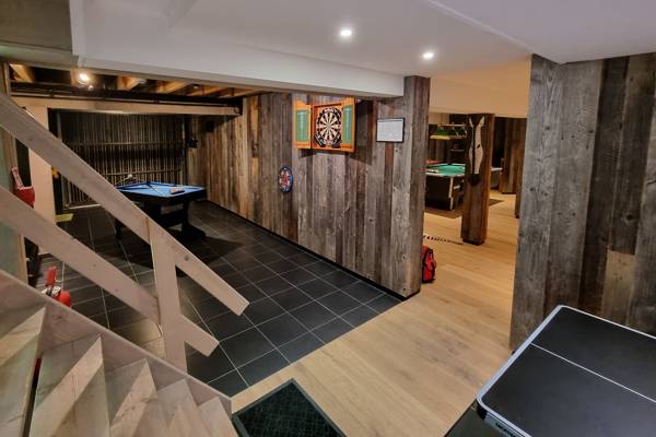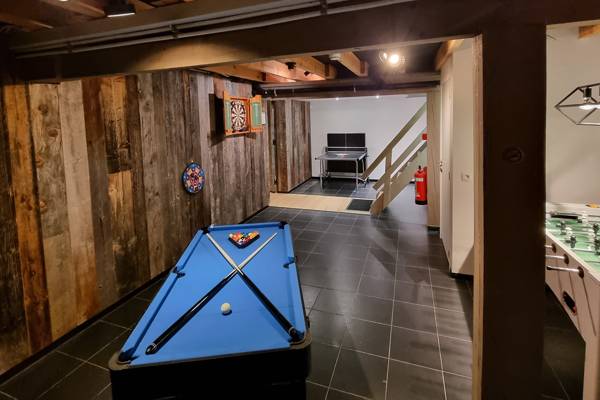 Verdeeld over 3 niveaus, vindt u op de begane grond een grote woonkamer met zithoek en kachel, eetkamer en open ingerichte keuken. U vindt dan een speelkamer/slaapkamer, een doucheruimte met sauna en een wasruimte die toegang geeft tot de kelder/niveau -1 en directe toegang naar buiten. Boven zijn 5 slaapkamers, allemaal ingericht volgens een ander thema en waarvan twee met een klein terras. Ook vindt u er een mooie badkamer met ligbad, douche en toilet.