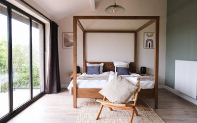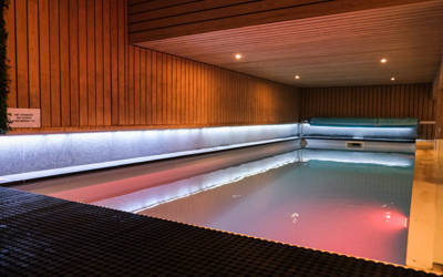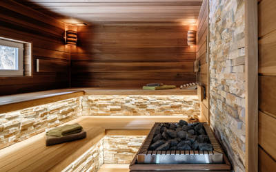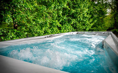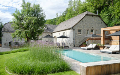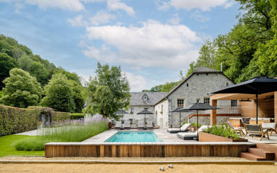De inpandige sauna is aan de voorzijde voorzien van een glas pui. De 6-persoons jacuzzi staat achter op het terras en geeft uitzicht op de Ourthe.