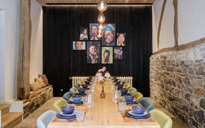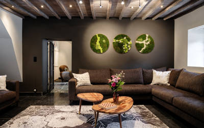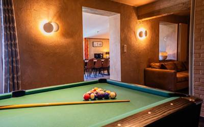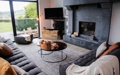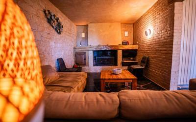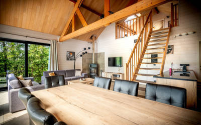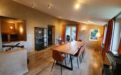Het interieur van de woonkamer is uitgerust met een centraal gelegen grote openhaard. De woonkamer biedt voldoende ruimte voor 12 personen. Naast de eettafel in de living, heeft deze villa een aparte eetkamer met extra open haard. Er is boven een aparte bibliotheek waar u rustig een boek kunt lezen.