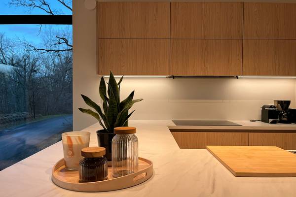 Het huis wordt in de winter verwarmd via vloerverwarming, die in de zomer dan ook de ruimte afkoelt, zodat het in elk seizoen gezellig blijft binnen.
