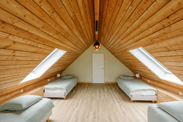 Verdieping: een grote slaapkamer met 4 bedden (flexibel in te delen voor privacy) en nog een extra slaapkamer voor 2 personen.