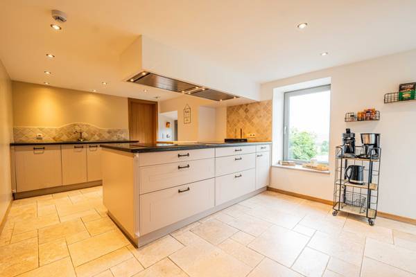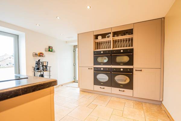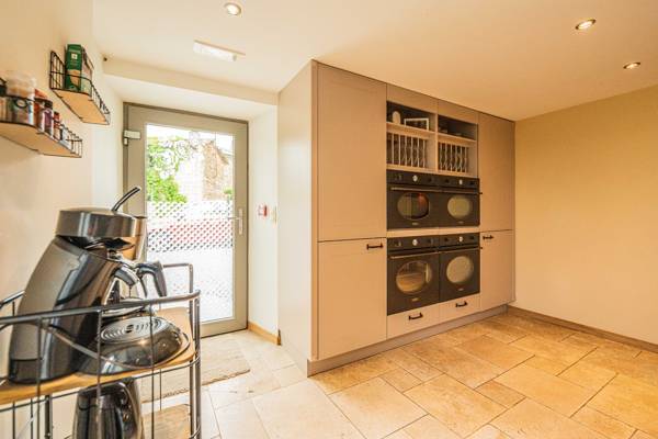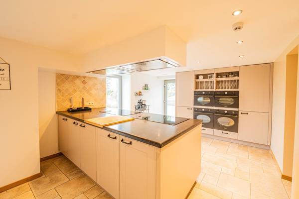 In de mooi ingerichte woonkamer staat een eettafel met voldoende stoelen. De luxe keuken is ingericht met alles wat u nodig heeft, o.a. een vaatwasser, 2 hete lucht ovens, 2 magnetrons, 2 koelkasten.